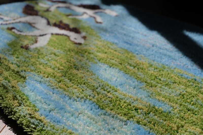 会期中木枠に固定し展示しております。ご購入後、木枠に貼った状態のまま発送、またはラグとして使用希望どちらかお選びいただきます。