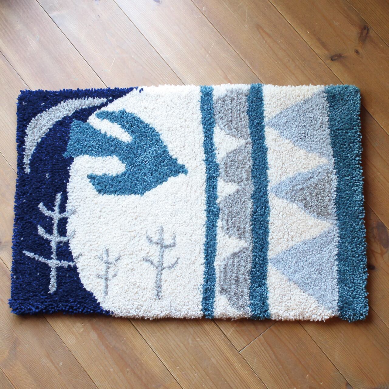 鳥たちはただ楽しく空を飛ぶこともあるのでしょうか。かっこよくて美しいツバメの飛翔を描きたくてつくったラグです。木や月、そしてジグザグと流れる川や山をイメージしたモチーフも楽しんでいただけたらと思います。