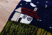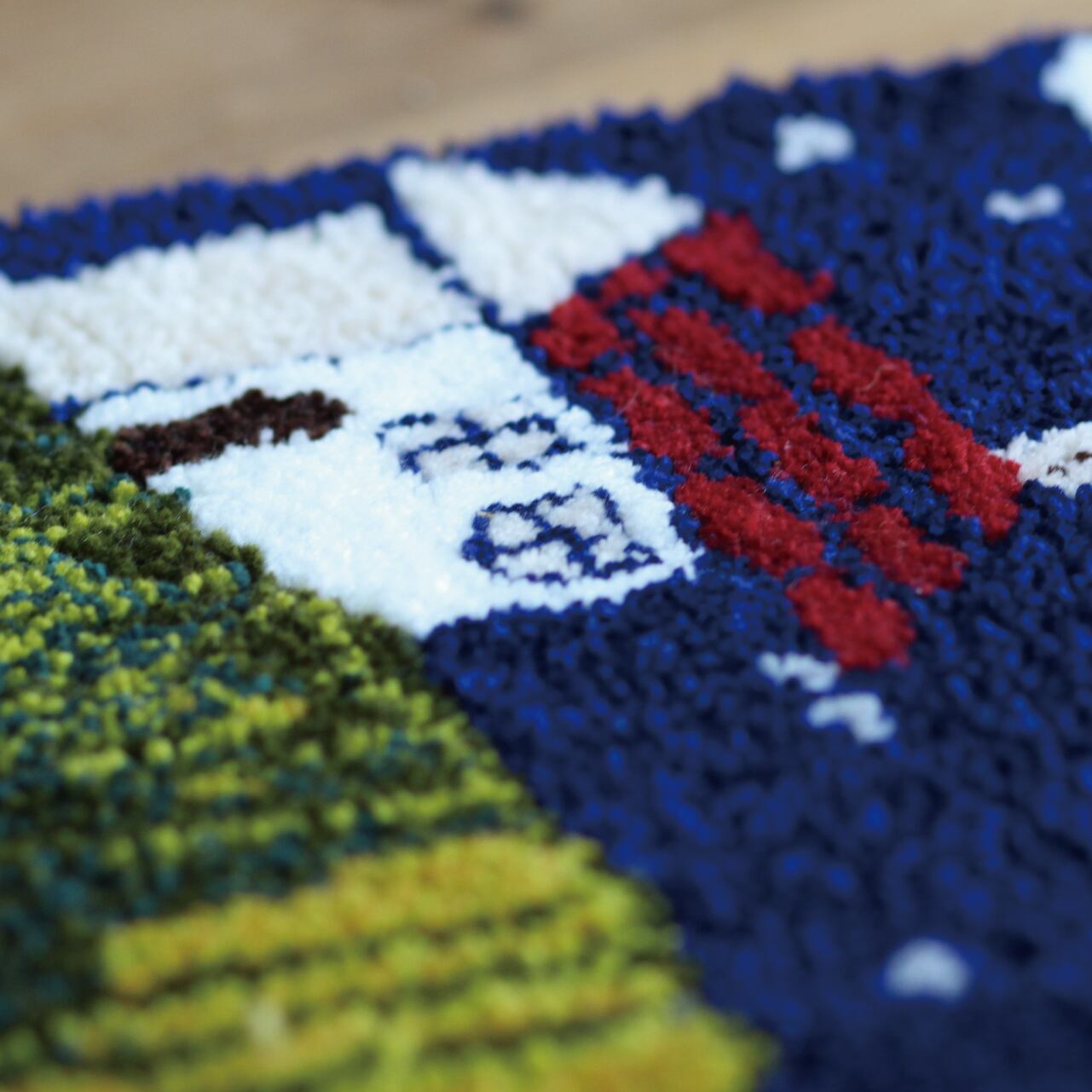 絵本のようにストーリーを思い浮かべながら描いたこのラグを、タペストリーにして壁にかけれるようにしました。