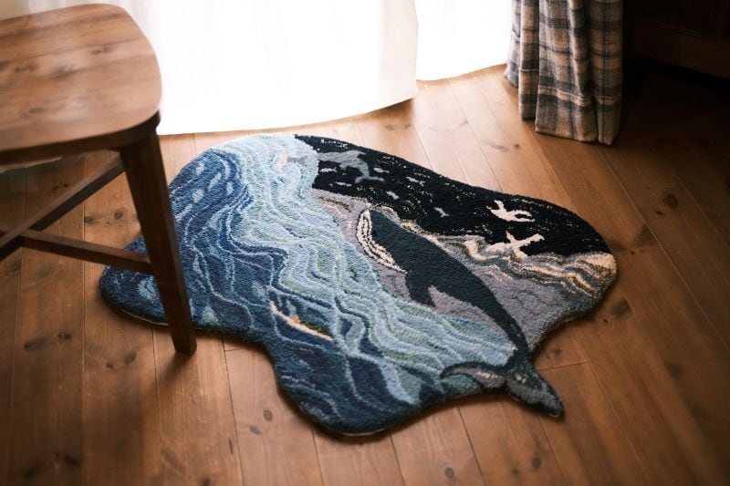 このラグにゴロンと寝そべったら、私も少しクジラの近くにいるような気持ちになれるかなと、夢心地で描きました。