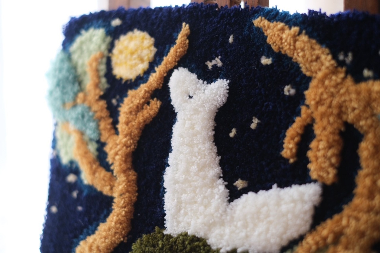 「森に住む白キツネ」という作品から飛び出した、ミニラグを作りました。